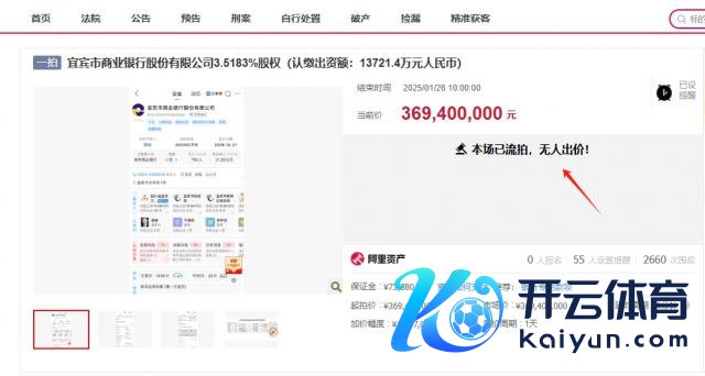 1 月 26 日,财联社记者自便到,阿里执法拍卖网站显露,宜宾市买卖银行股份有限公司 3.5183% 股权(认缴出资额:13721.4 万元东说念主民币)第一次拍卖至本日上昼 10 点实现。本场拍卖的起拍价为 369,400,000 元东说念主民币,因无东说念主出价已流拍。